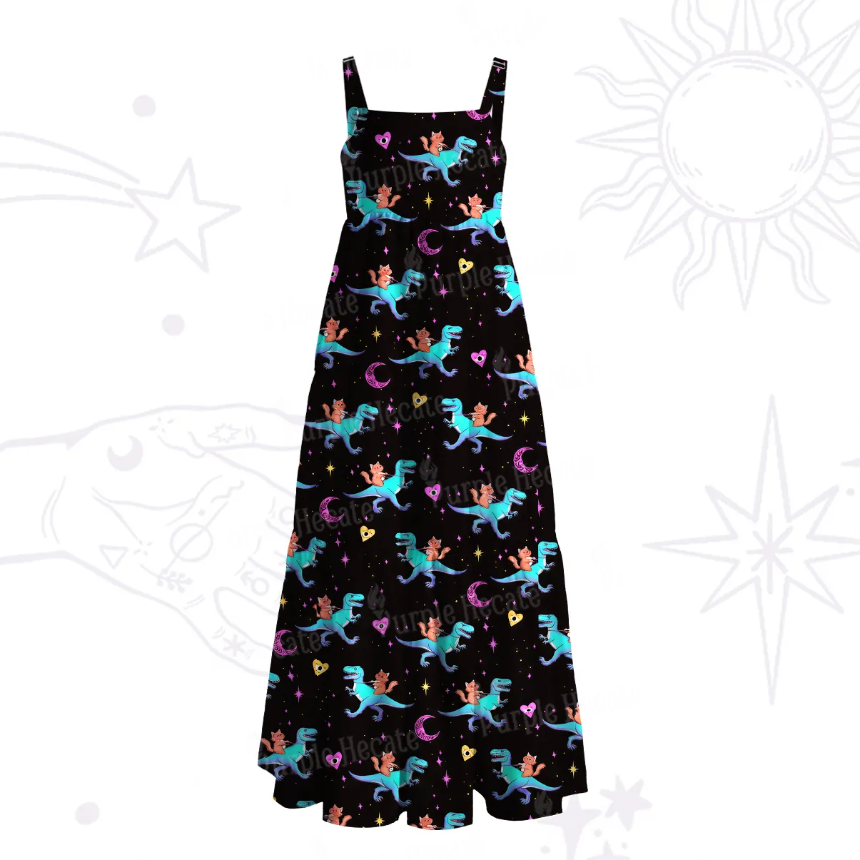 Fashion is power. And with Purple Hecate, that power becomes poetry in motion. Whether you’re drawn to the playful cats of the garden, the unicorns of the cosmos, or the sacred symbols of the sun and moon, each dress is a personal spell made visible.