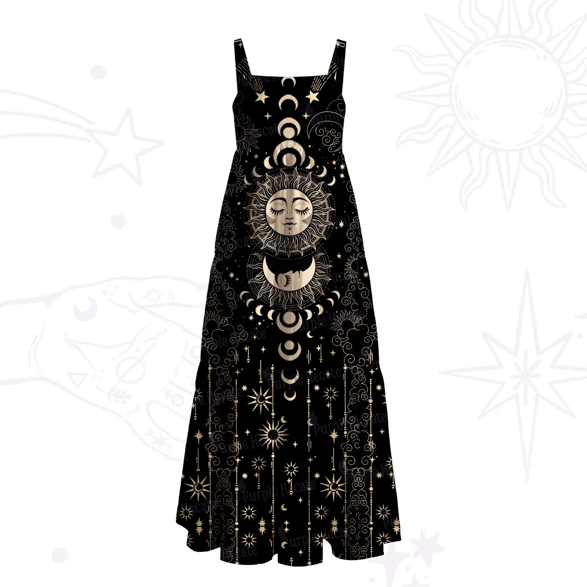 The Celestial Sun and Moon Dress evokes an ancient kind of power — the quiet, endless balance between light and dark. Printed in radiant gold against deep, starlit black, its artwork features a regal face of the sun surrounded by lunar crescents, celestial rings, and fine constellations. The result feels almost ceremonial, as if this dress were made for cosmic queens and modern mystics alike.