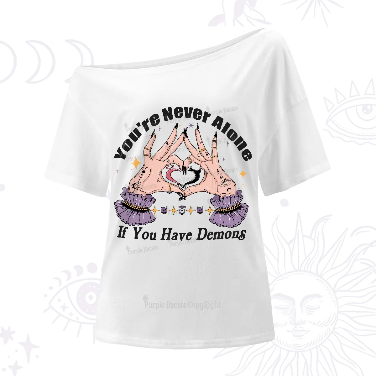 Each print is symbolic, tapping into astrology, mythology, witchcraft, and tarot — yet designed with a modern edge perfect for everyday wear. They’re conversation starters, mood boosters, and subtle affirmations rolled into one. When you wear a PurpleHecate one‑shoulder tee, you aren’t just dressing up — you’re aligning your outer look with your inner energy.