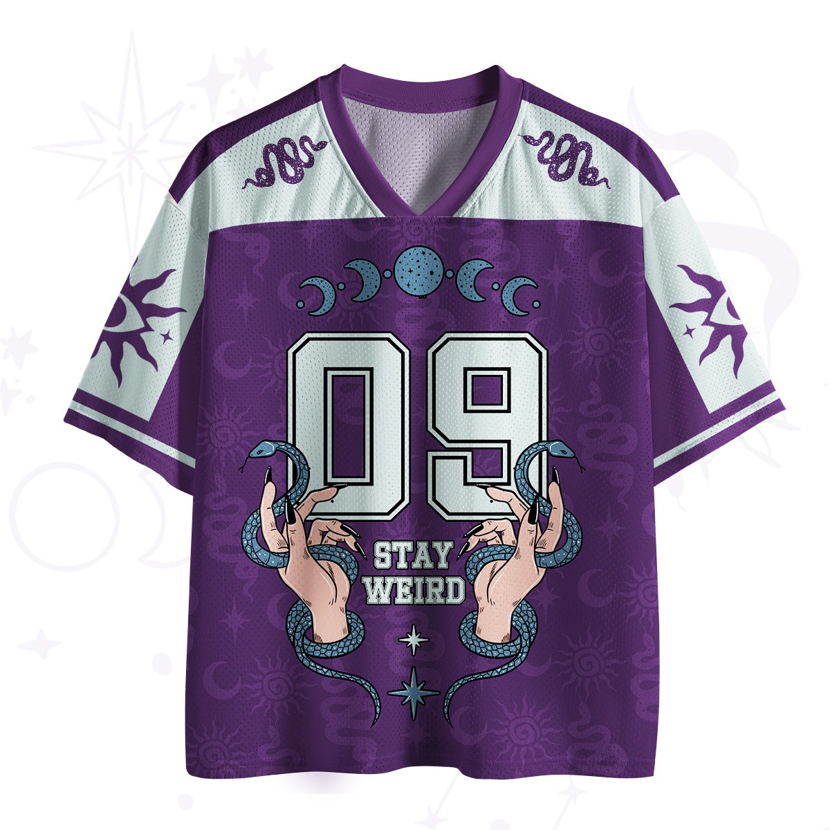 The Stay Weird 09 Jersey is a celebration of individuality and self-expression. This deep purple jersey features the phrase “Stay Weird” alongside celestial symbols, mystical hands, and coiled snakes. The bold “09” lettering adds a sporty touch, while the intricate designs make it uniquely magical.