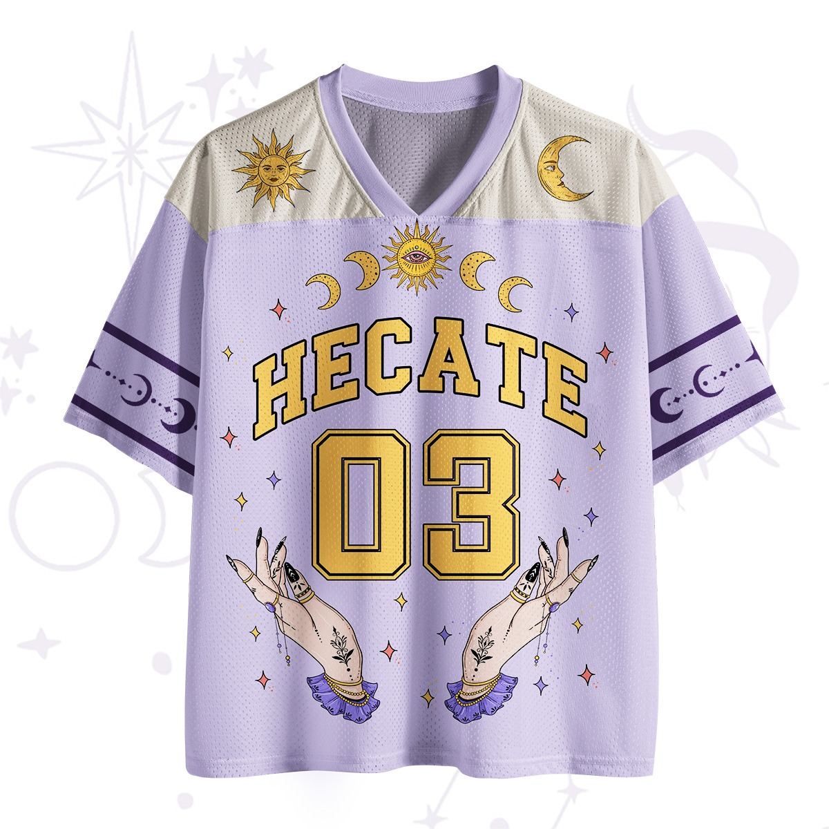 The Hecate 03 Jersey is a tribute to the goddess of magic, witchcraft, and the moon. This lavender jersey features celestial motifs, including crescent moons, suns, and stars, surrounding the bold "HECATE 03" lettering. The intricate design of mystical hands adds a touch of mystery and power, making this jersey a wearable piece of art.